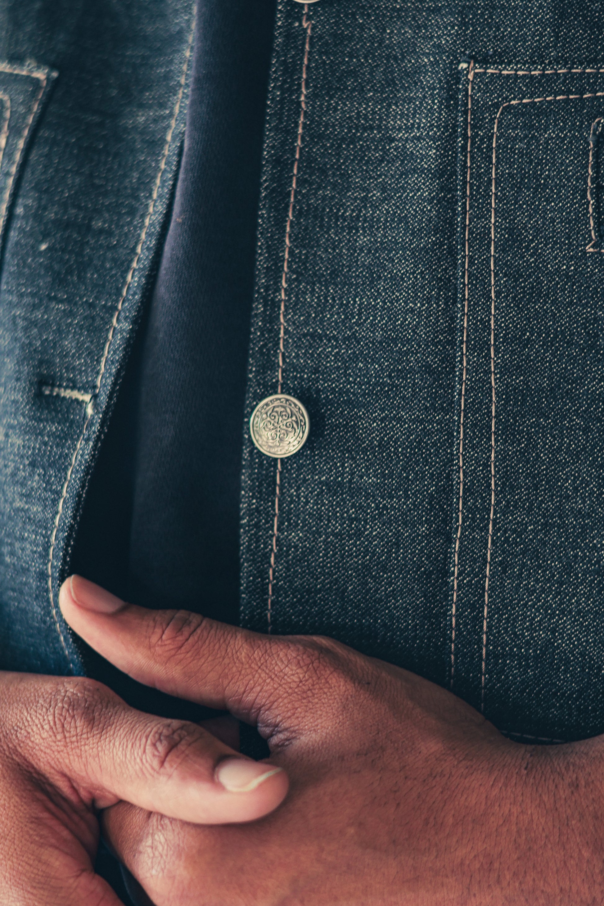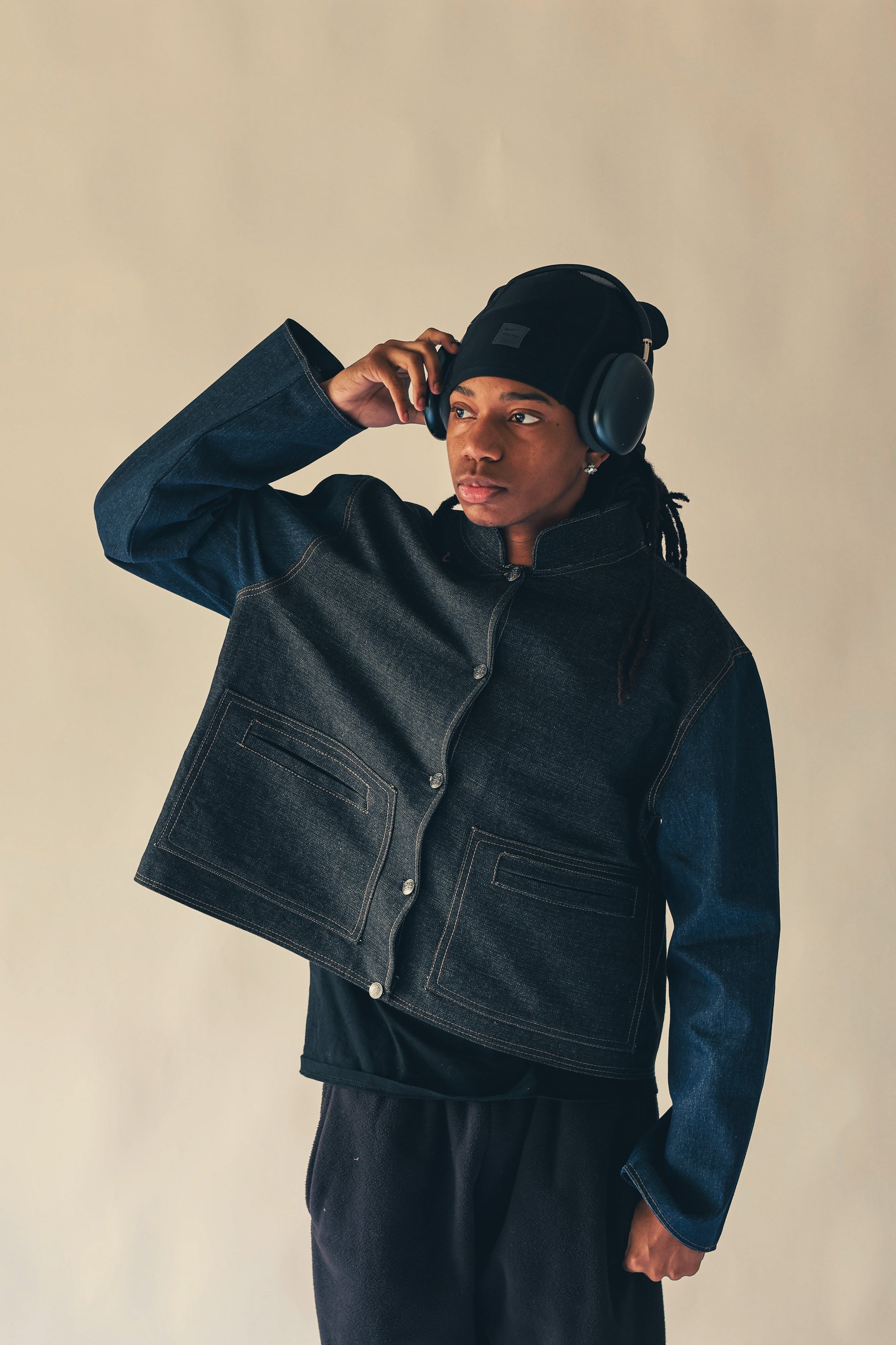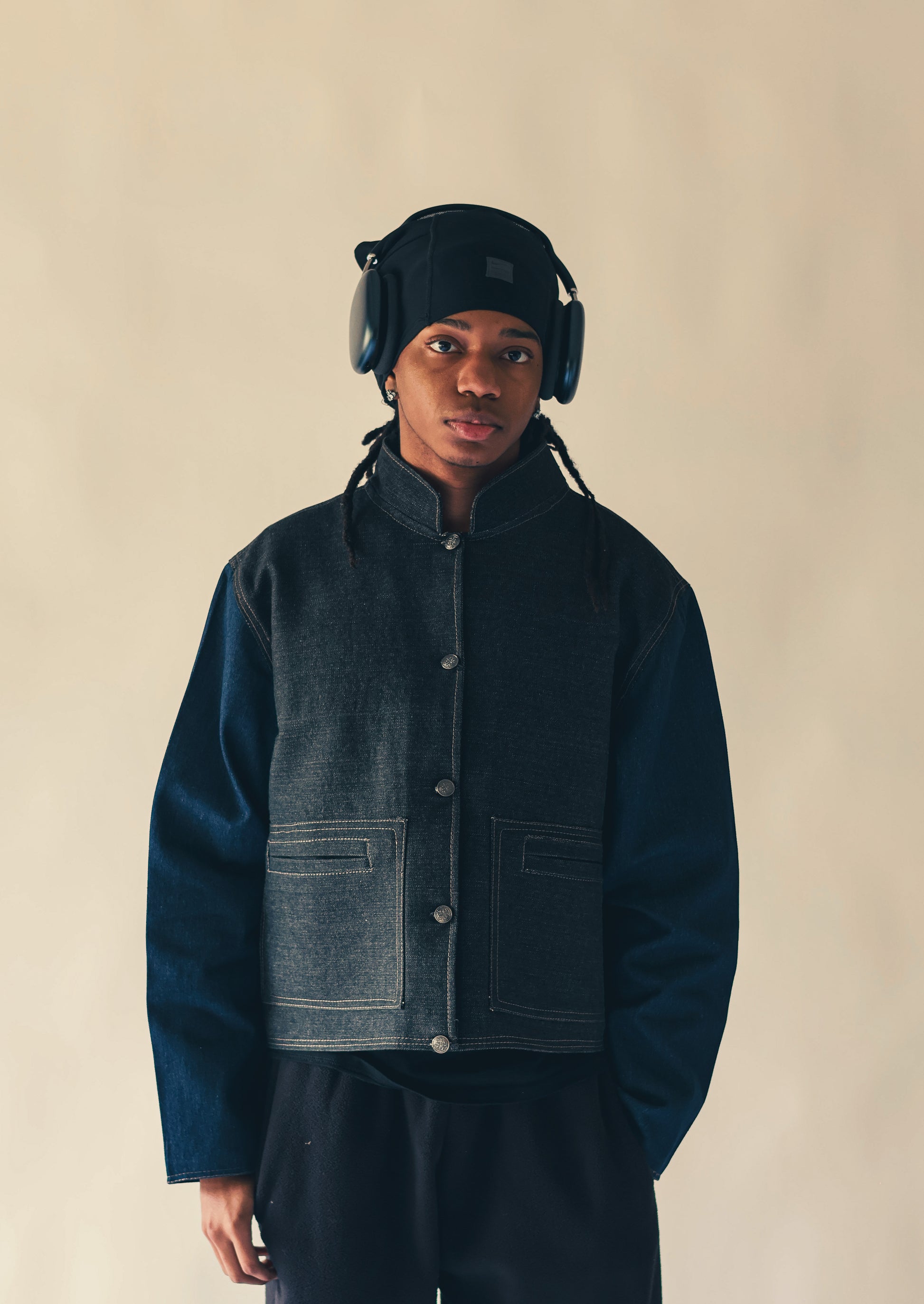 This stylish two-tone denim jacket features a sleek Mandarin neckline and a cropped, baggy silhouette for a modern streetwear look. Designed with a unique patch pocket and double welt pockets for added functionality, it blends fashion and practicality effortlessly. Crafted from durable 9.5oz 100% cotton denim, this jacket is built to last, with reinforced topstitching that enhances both its durability and visual appeal.